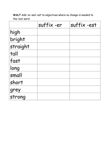 Here is what is included in this grammar sort and activities resource24 CardsWith these cards you can use the sorting headers to have students sort the base word, then the base word with er, and finally the base word with est There are 8227 $300 PDF There are 4 different activities to work on adding er and est for adjectives that compare Activity 1 4 worksheets There are 2 worksheets (one has y needing to be changed to i and one does not) with 2 different ways to do the worksheet The first way, all of the base words are given and studenSpelling games using the word list er and est suffixes Test yourself using the ' Listen and Spell ' spelling test Print worksheets and activities using the word list er and est suffixes Printable word list a useful printable resource of the word list Flash cards a word on each card which enables a variety of games and activities